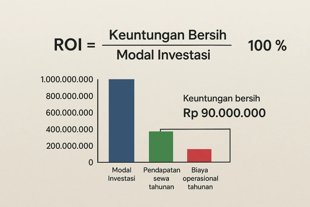Sebagai gambaran kasar: jika kamu membeli rumah seharga Rp 1 miliar, dan selama setahun kamu memperoleh pendapatan sewa bersih (setelah semua biaya) Rp 80 juta, maka ROI = (80 juta / 1 miliar) × 100 % = 8 % per tahun. Tapi itu versi sederhana — akan kita bedah lebih jauh supaya akurasi makin tinggi.
