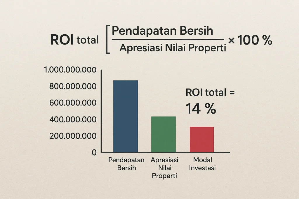 ROI total = [(Pendapatan Bersih + Apresiasi Nilai Properti) / Modal Investasi] × 100 %